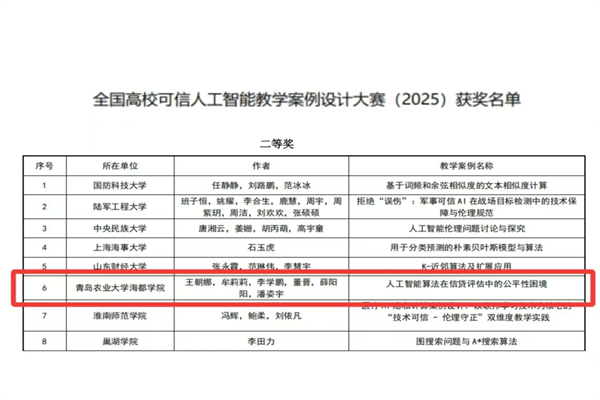 在第四届全国高校计算机课程思政教学案例设计大赛中,我们多个教师团队斩获殊荣。由王朝娜等多位老师共同设计的《人工智能算法在信贷评估中的公平性困境》教学案例,凭借其深刻的思政内涵与专业深度荣获二等奖;牟莉莉团队、王振团队提交的案例分别获二、三等奖。此外,王朝娜等老师设计的《人工智能算法在信贷评估中的公平性困境》还在全国高校可信人工智能教学案例设计大赛(2025)荣获二等奖。