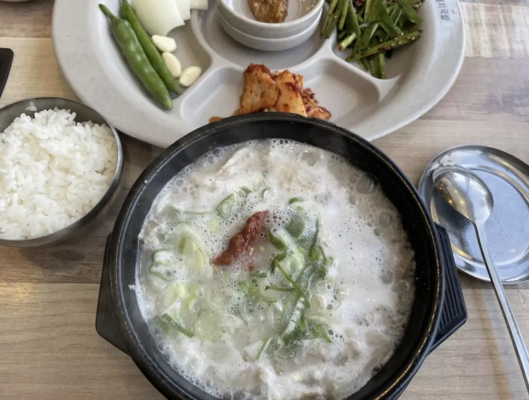 为了这碗猪肉汤饭,大概坐了一个半小时的高速大巴,不管多累多晚,我都要来吃他们家的汤饭!汤特别浓郁,特别的香,不管吃多少,百吃不厌,百吃不腻!一份猪肉汤饭大概12000韩币,汤饭必备小韭菜一定要一起尝尝!小菜超级多,饭和小菜是无限自助的哈哈~ 满满的猪肉,汤熬到了纯白色!汤饭端上来的那一刻,汤还在呲啦呲啦!”