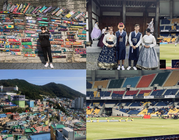 学习之余,我会去韩国各种景点打卡。曾经去过大邱的现代胡同、博物馆、教堂、三一台阶、宗教学校、修女堂、东城路、前山、釜山的松岛、五六岛天空步道、影岛、太宗台、白浅文化村、南港大桥、广安里海水浴场、东柏岛、甘川文化村、广安里大桥、海云台、南浦洞、西面 、乐天免税釜山总店;首尔的新沙洞、东大门、天空公园、梨泰院、南山、首尔塔、明洞、韩国第一高乐天世界塔;全州的韩屋村、壁画村、全北大学。在领略了韩国的名胜古迹后,让我对韩国文化有了更深入的了解。
