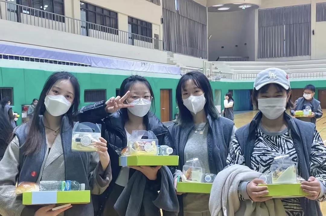 “活动地点在室内体育场,有韩国的学生在门口做来往人员的记录,并负责发放礼品。其中包括小蛋糕、口罩、消毒液、口罩挂绳等等。
