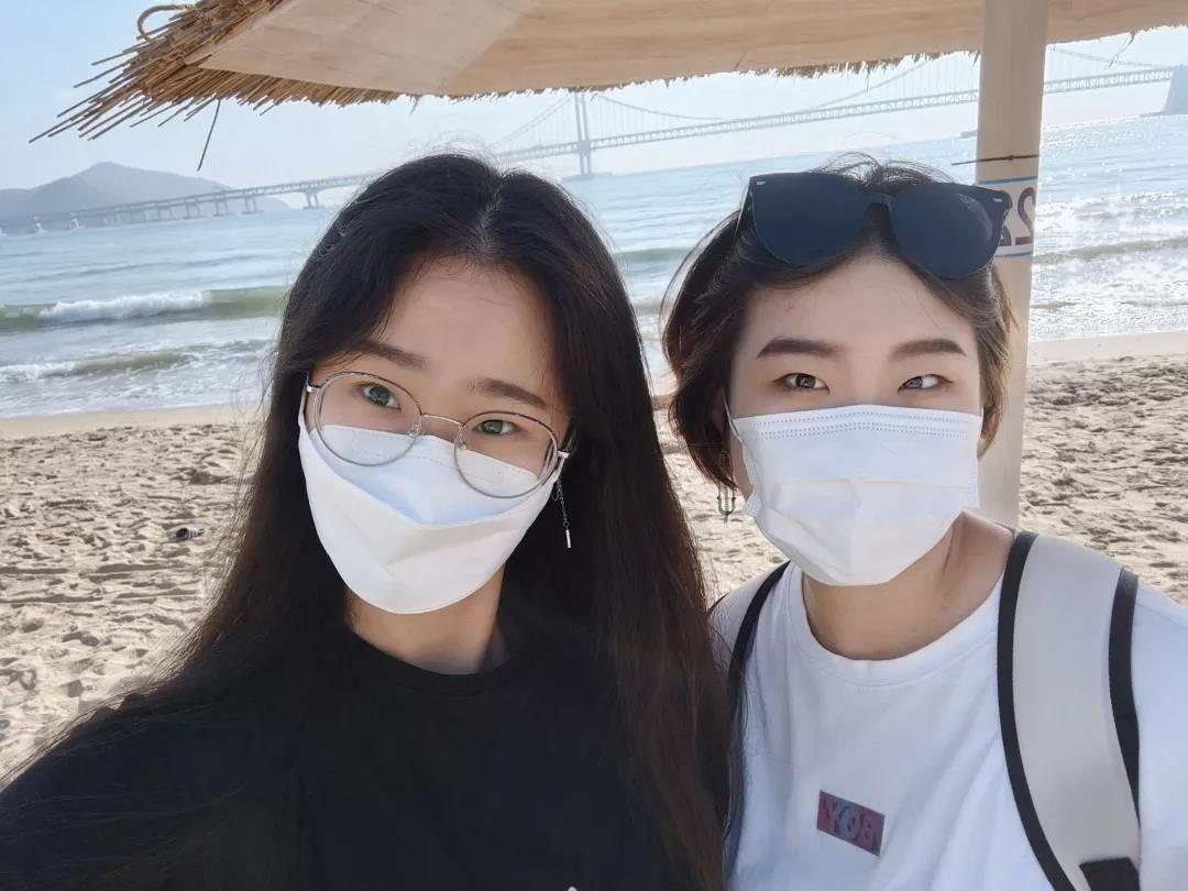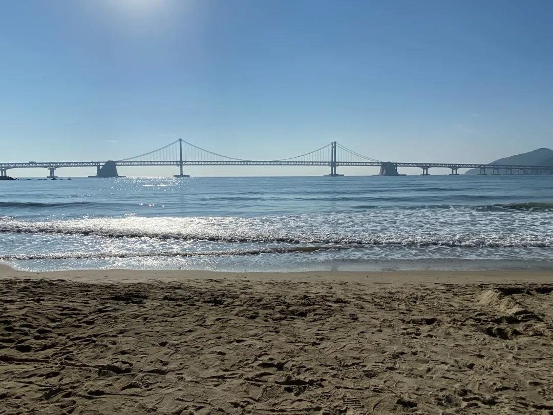 “去釜山当天,我和肖玉欣一起早上五点半起床坐车,到了汽车站再坐地铁,比较方便的是,韩国的公交卡不仅可以坐公交车,也可以坐地铁。第一站去了广安里,沙滩很干净,海水很清澈,阳光正好,远处的桥上川流不息。”
