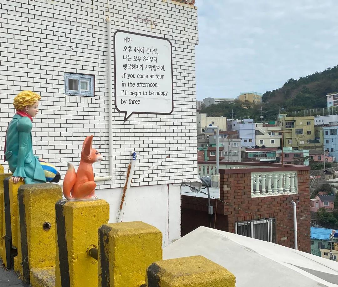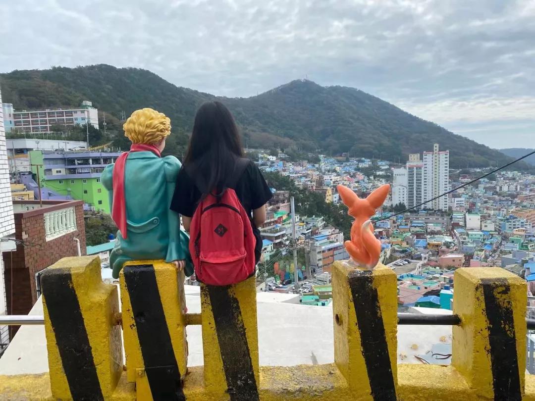 “从海云台出发我们坐公交车,准备去甘川洞文化村。这一路颠沛流离,由于路程较远,也比较拥堵,再加上早上起的比较早,身体有点吃不消。终于到了甘川洞文化村,买了一张地图,顺着地图上有印章的位置打卡,来玩的人不少,景色也如介绍的一样很温馨可爱。我们在露天的咖啡厅歇歇脚,远处一眼望去都是彩色的小房子,这里的生活大概可以用怡然自得来形容吧。和小王子与沙漠狐狸拍了照,好像真的穿越进了童话世界一样,变回了小孩子。下午原本打算去吃海底捞,海底捞的服务员长得很帅气,是个会说中文的小哥哥,但是排队的人很多。于是去周围的店转了一下。海底捞旁边有唐人街、中国超市、麻辣烫、羊肉串等各种中国美食店。吃过饭去了南浦洞,各种潮牌店汇集在这里,一边走一边逛,直到天黑。游玩的时间过的真的非常快,以后有机会的话还会来这里。”
