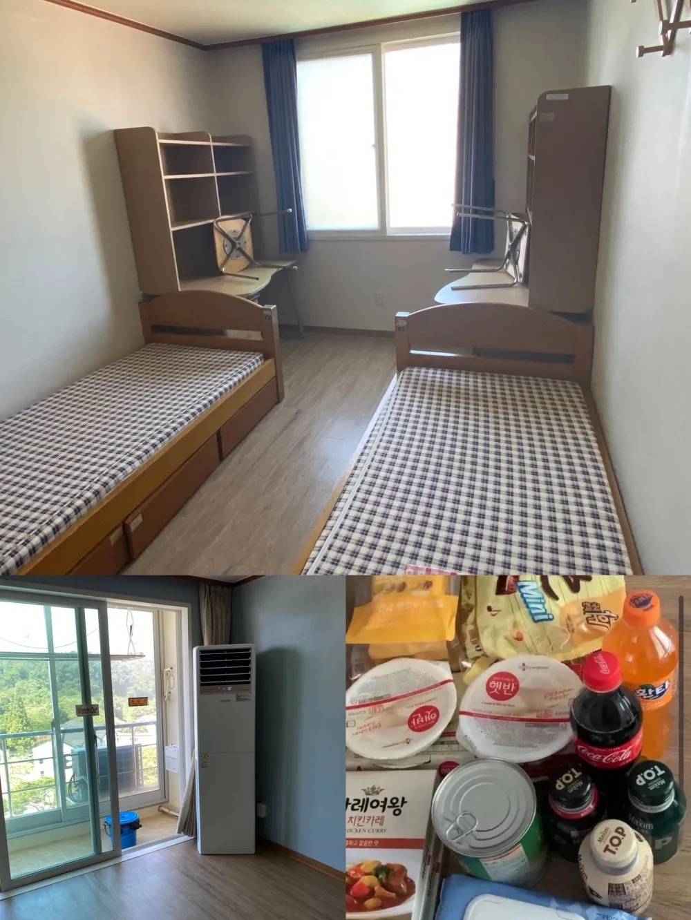 第二天核酸检测结果出来了,大家都非常健康。随后我们坐车去了庆尚国立大学的宿舍隔离。宿舍非常大,有一个客厅,一个厕所,一个洗漱间,还有阳台,还配备WiFi、空调等,可以说一应俱全,第一天还给我们送了两个大箱子的隔离物资,里面竟然还有肥宅快乐水,快乐起来了~