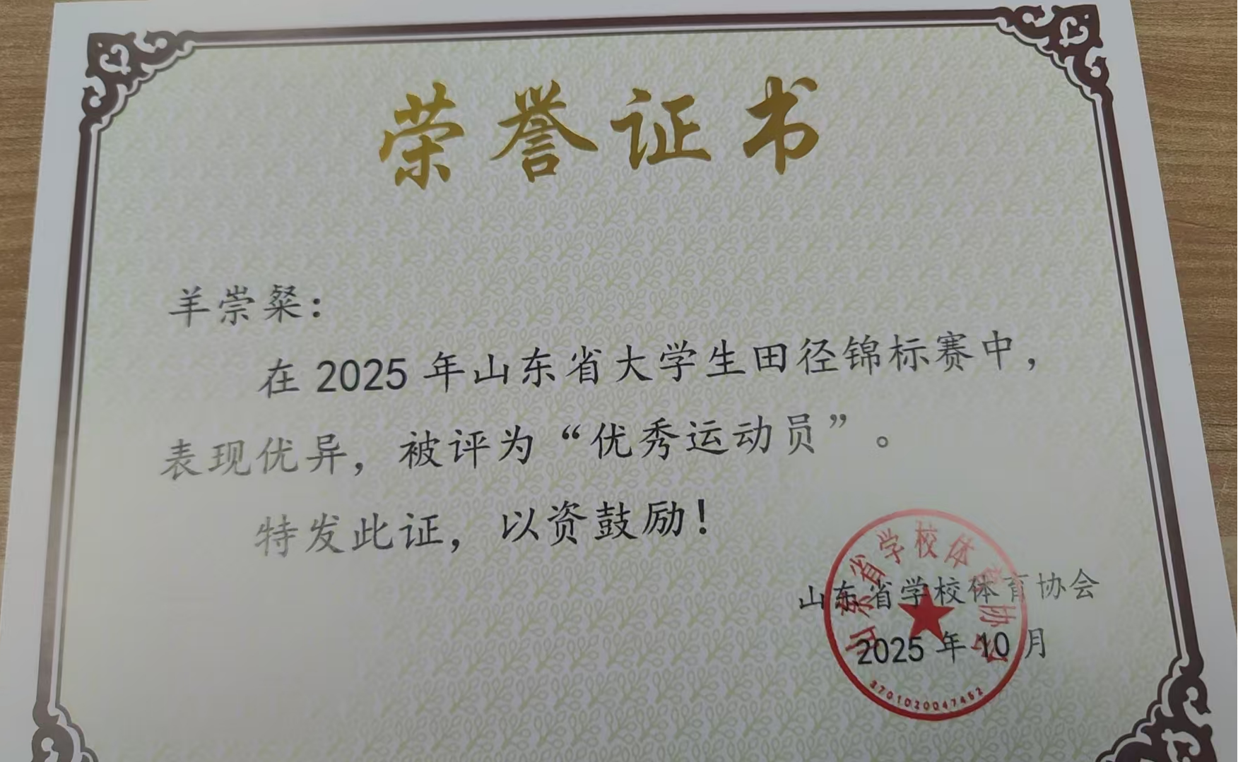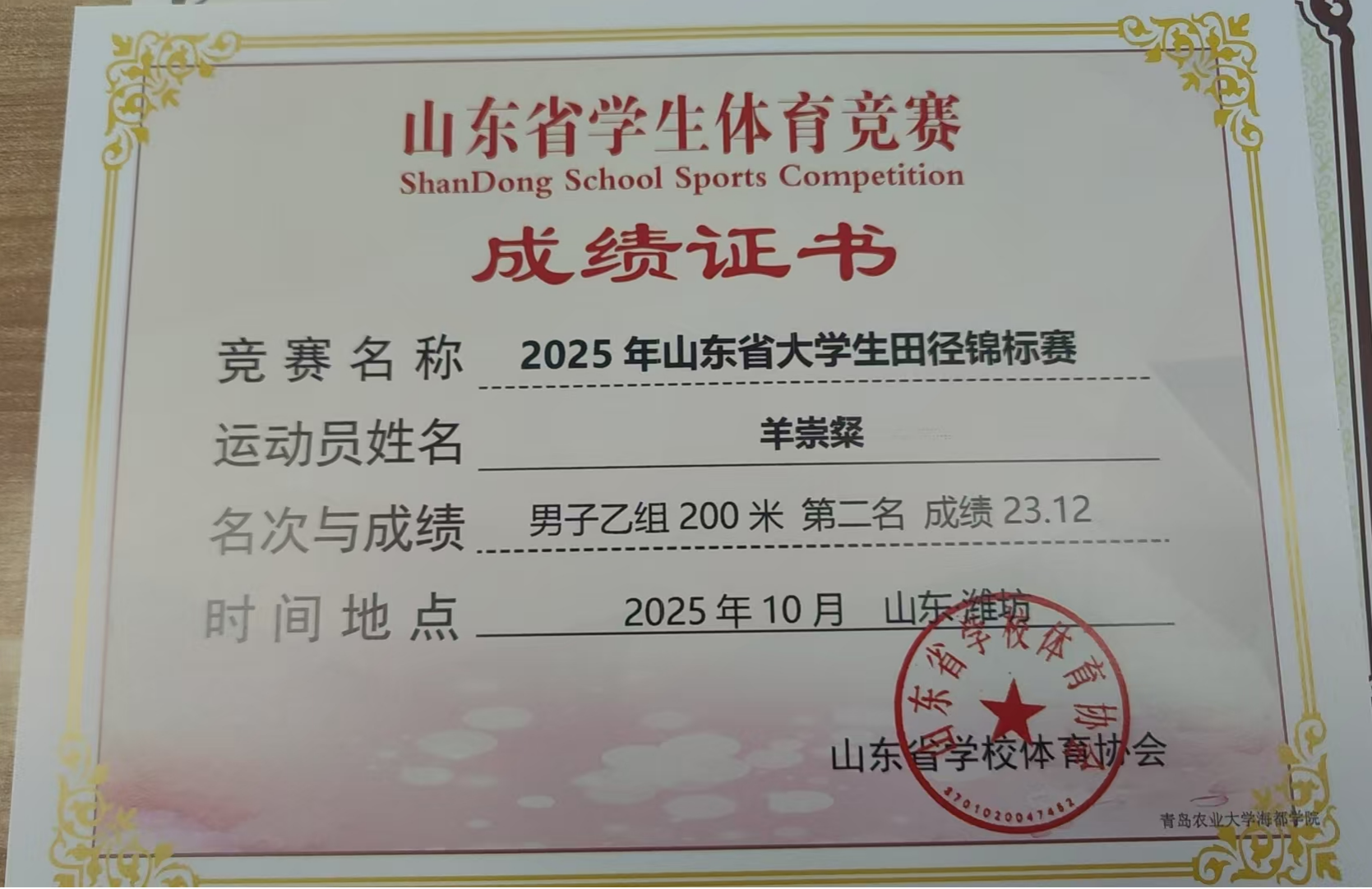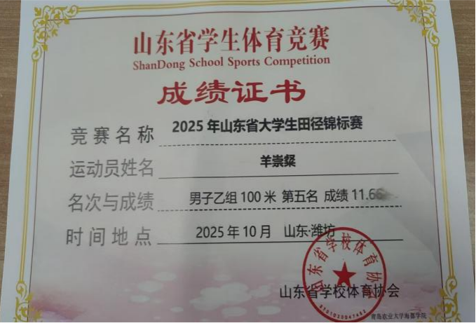 2025年10月9日至10月14日,由山东省教育厅、山东省体育局联合主办的2025年山东省大学生田径锦标赛在潍坊奥林匹克体育公园隆重举行。经济与管理学院选派的四名优秀运动员——羊崇粲、王泽迅、周士超、王家烨代表学校参赛,凭借顽强拼搏的精神和出色的竞技水平,在赛场上展现了经管学子的青春风采与体育精神。